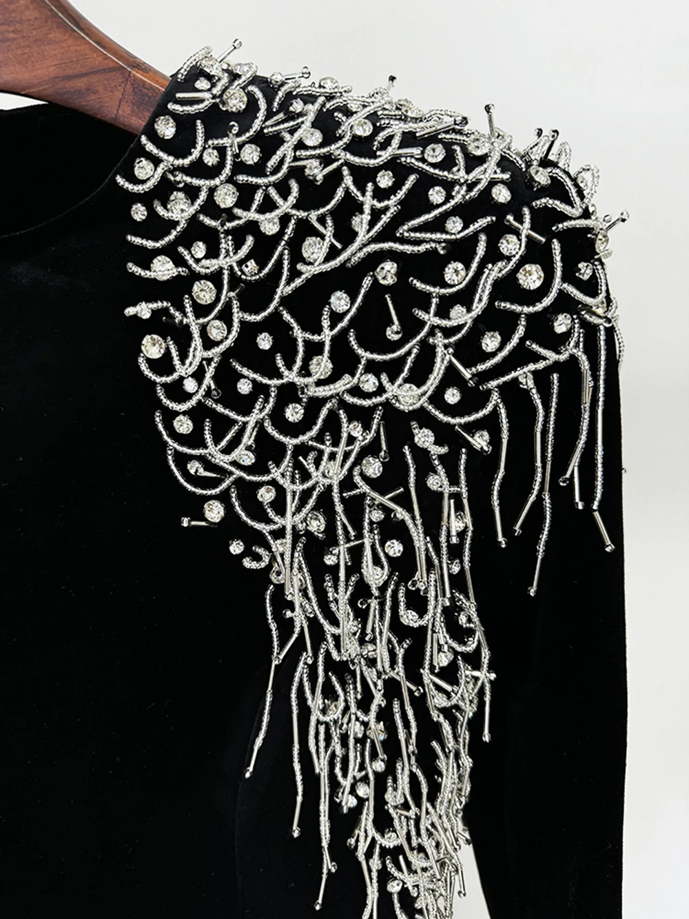 Step into sophistication and shine at your next event with the Beaded Design Velvet Floor Length Dress.