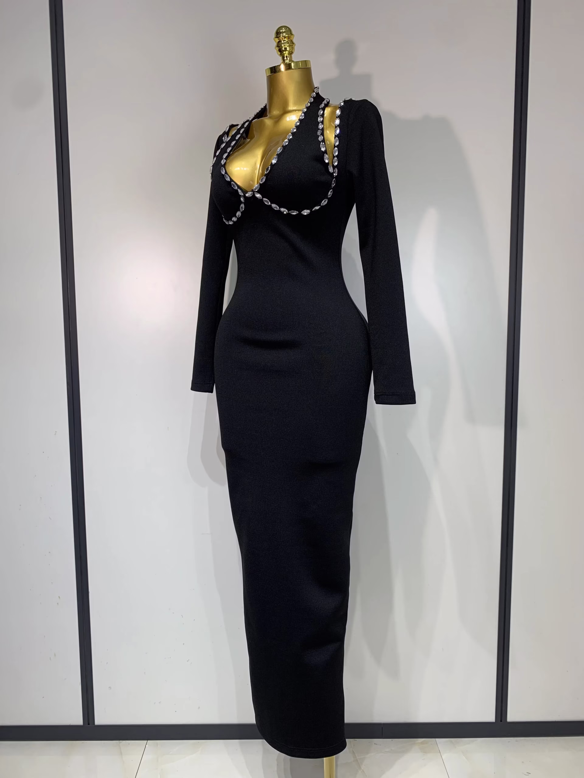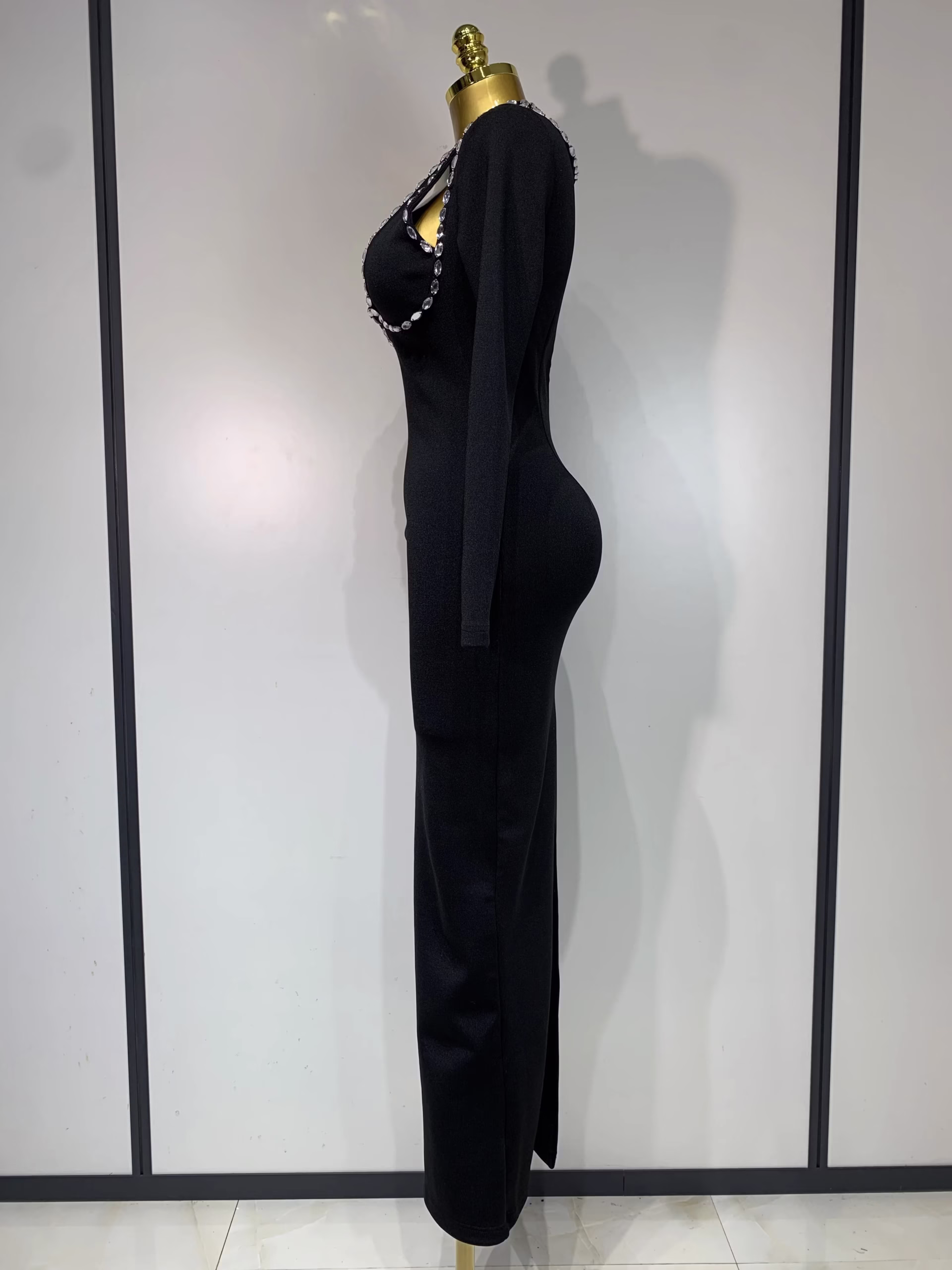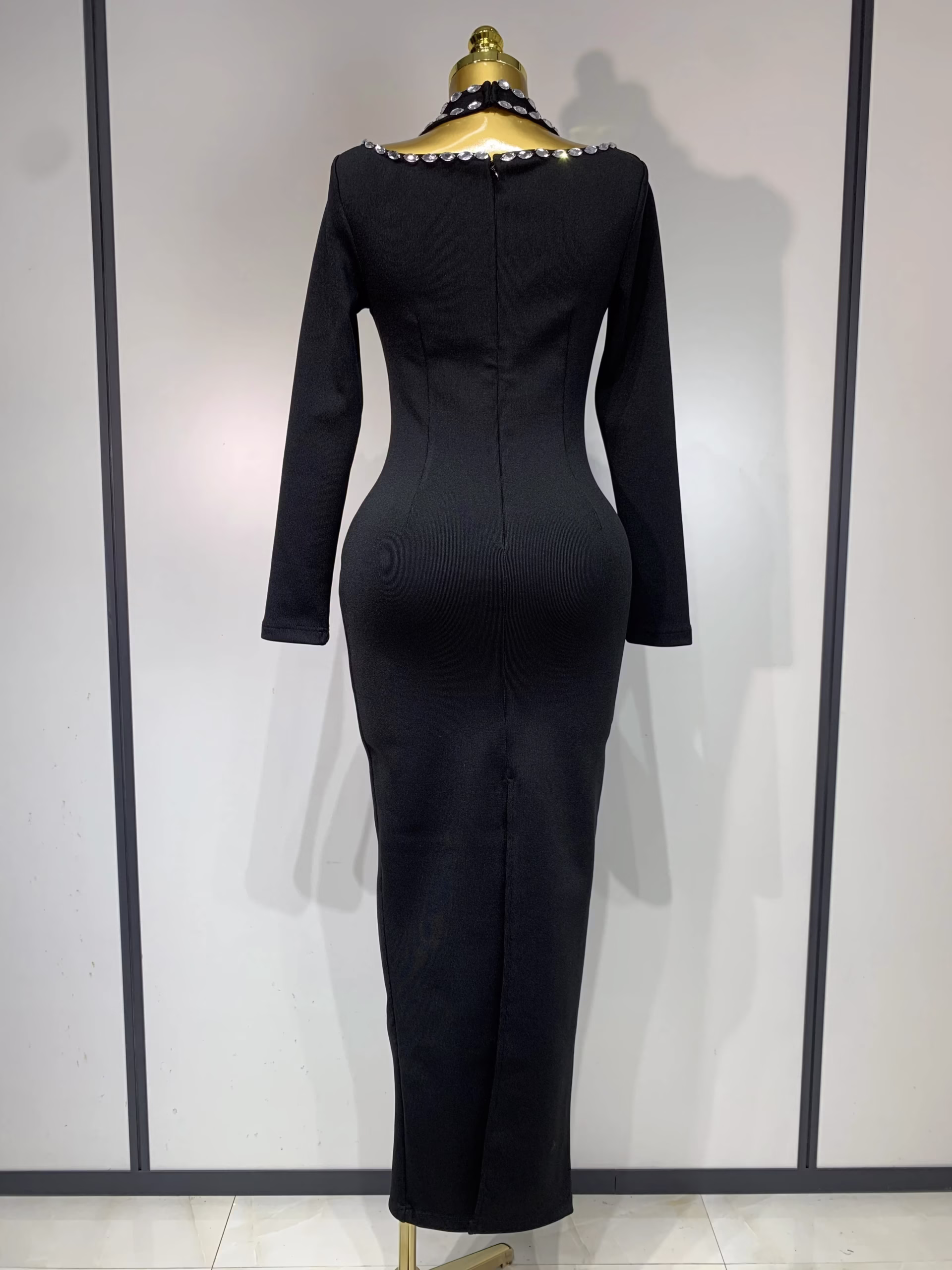 Notched Collar Rhinestone Maxi Dress
