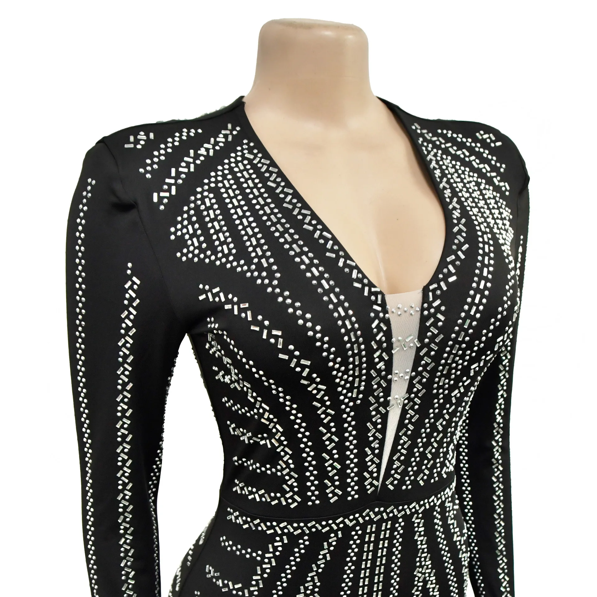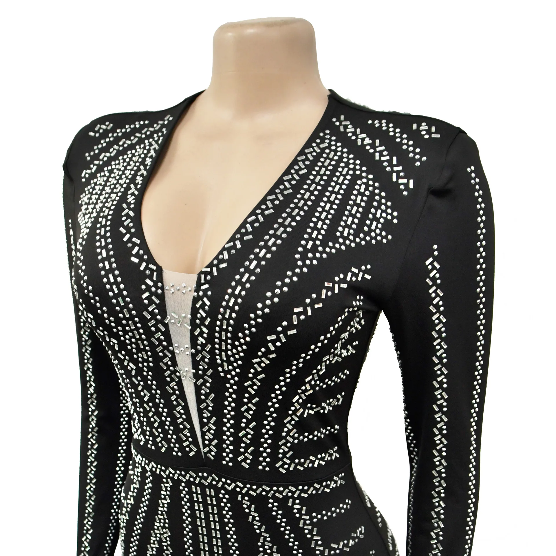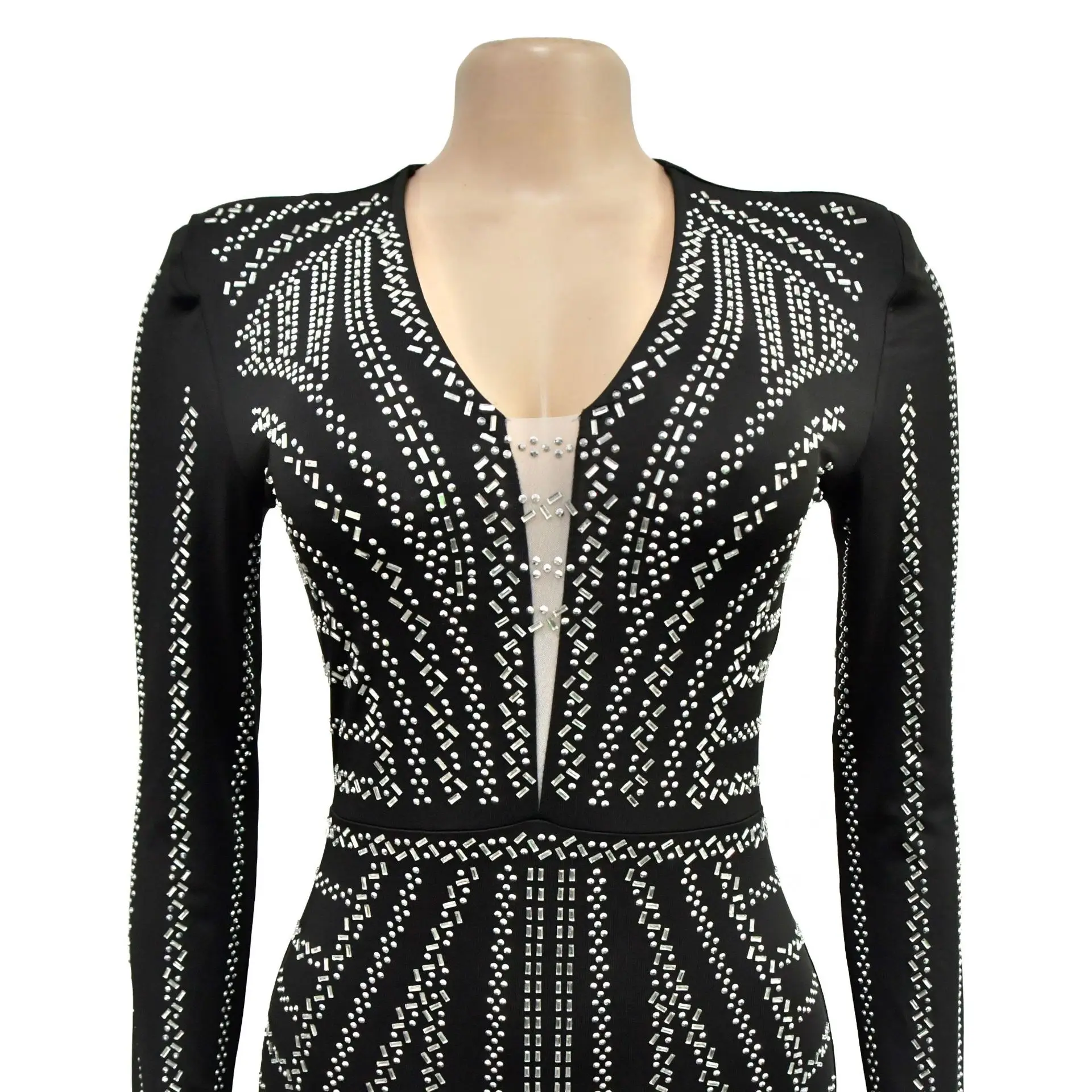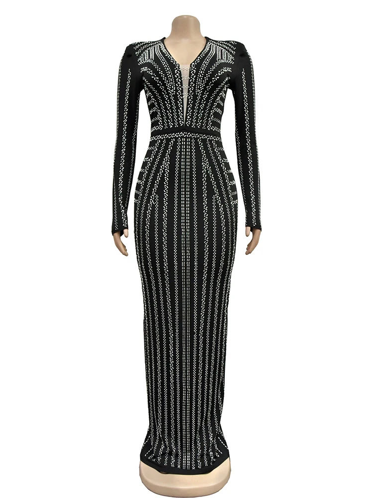 Stand out in style with our glamorous embellished bodycon dress. This ankle-length dress features a flattering V-neckline and full sleeves for a sexy and club-worthy look. Get ready to turn heads!