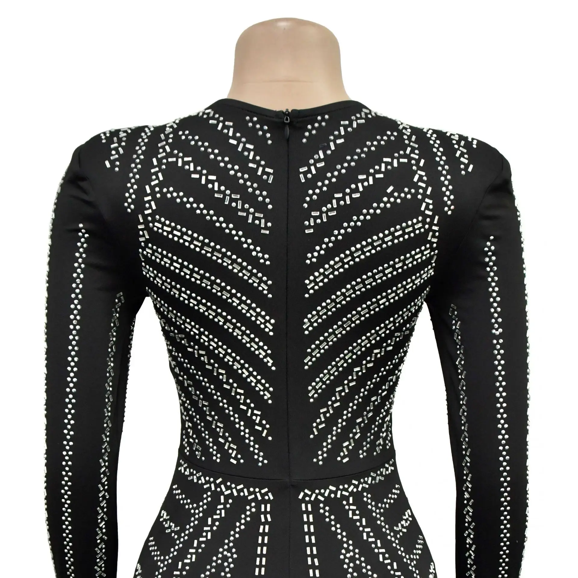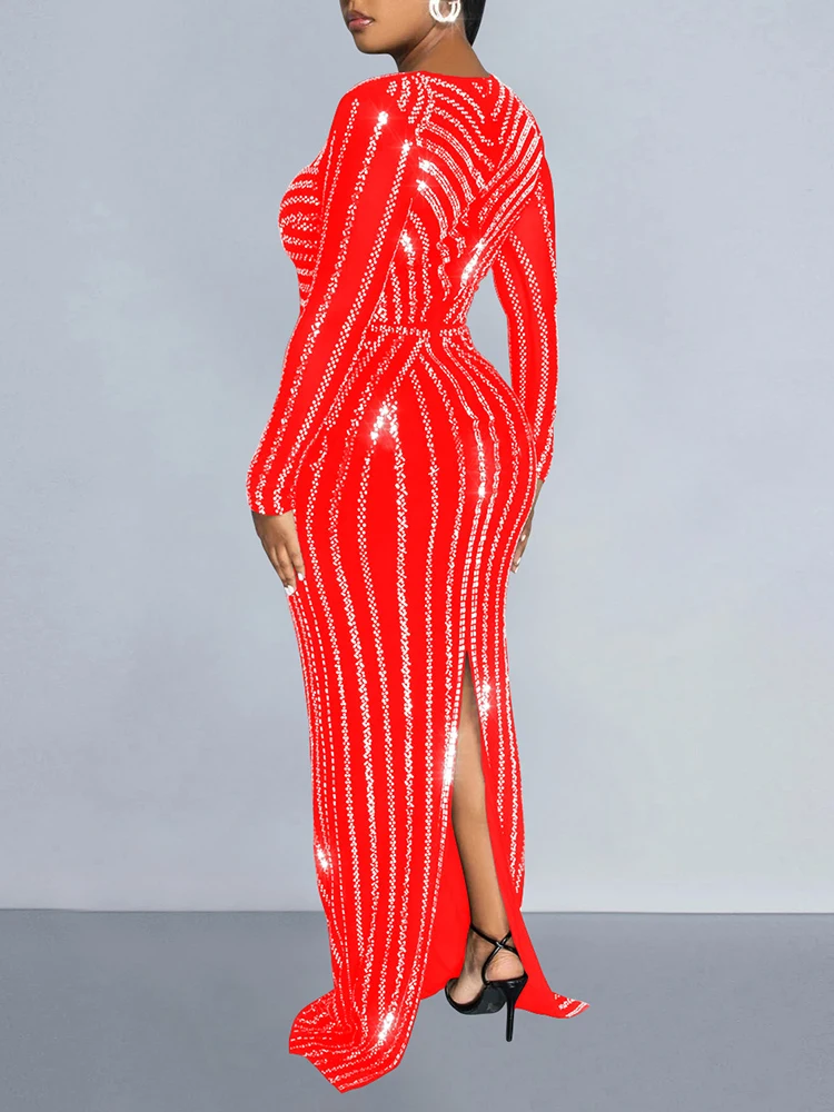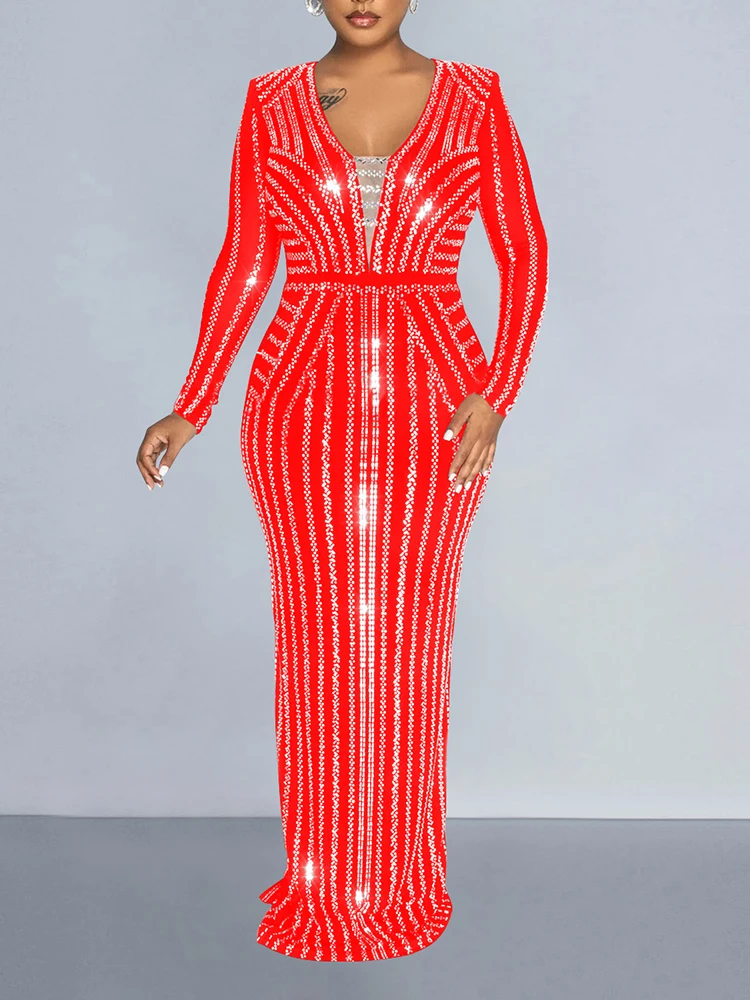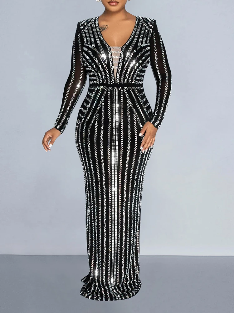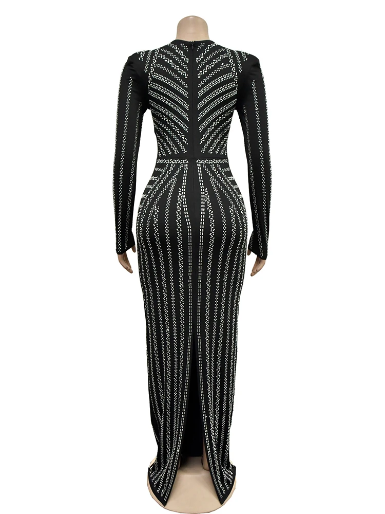 Stand out in style with our glamorous embellished bodycon dress. This ankle-length dress features a flattering V-neckline and full sleeves for a sexy and club-worthy look. Get ready to turn heads!