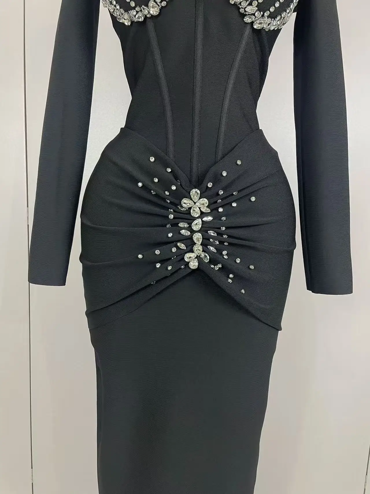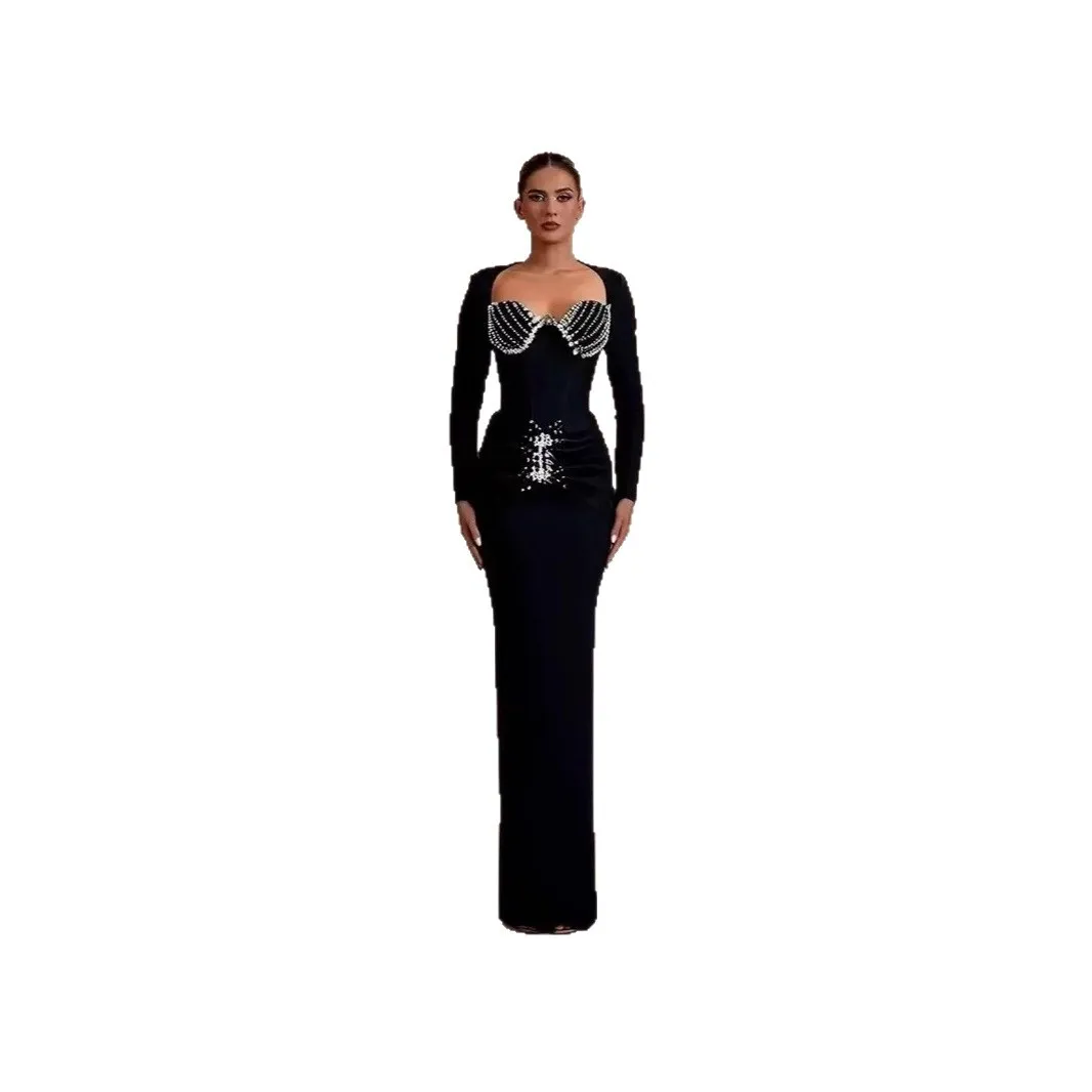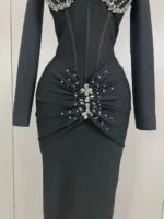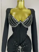 Shawl Collar Pearls Beaded Black Blazer Dress