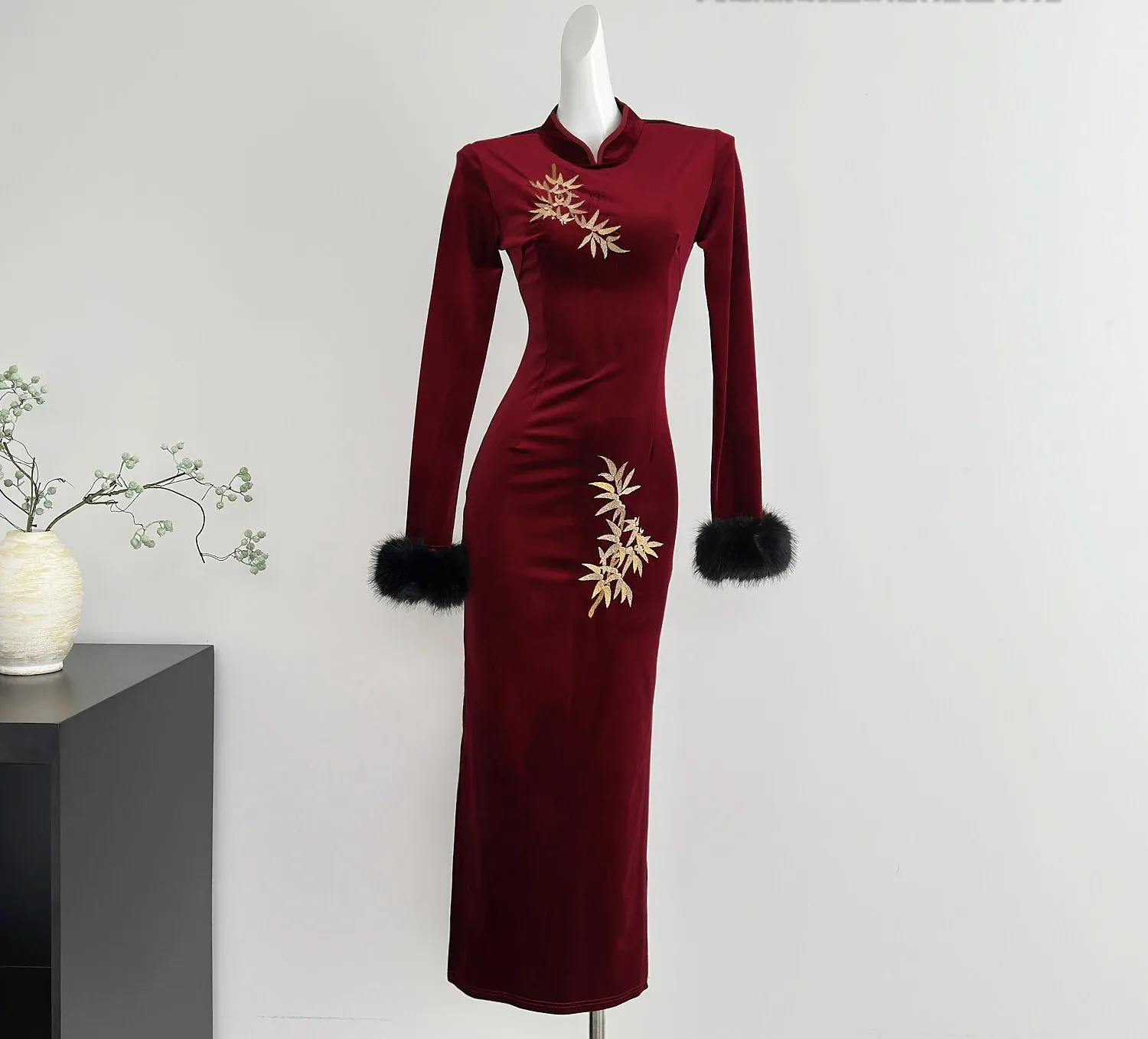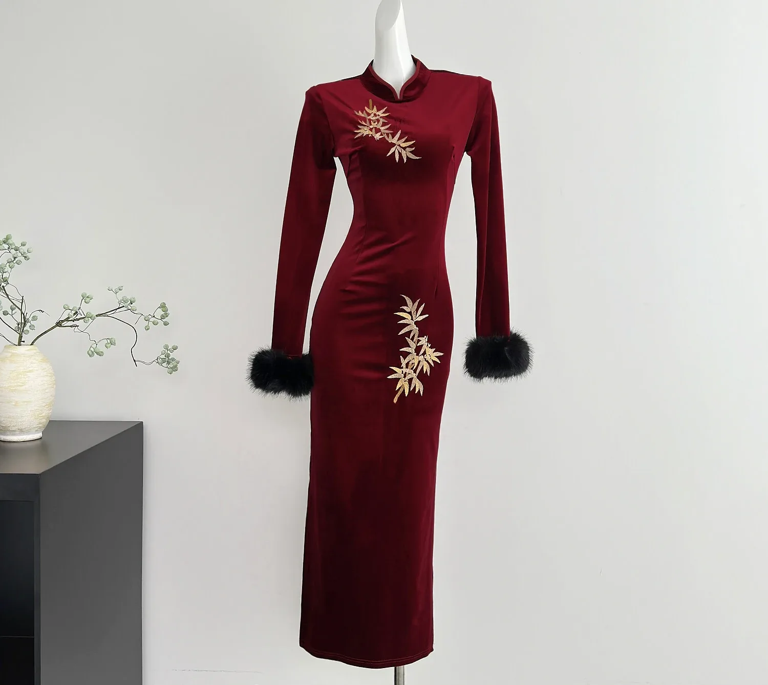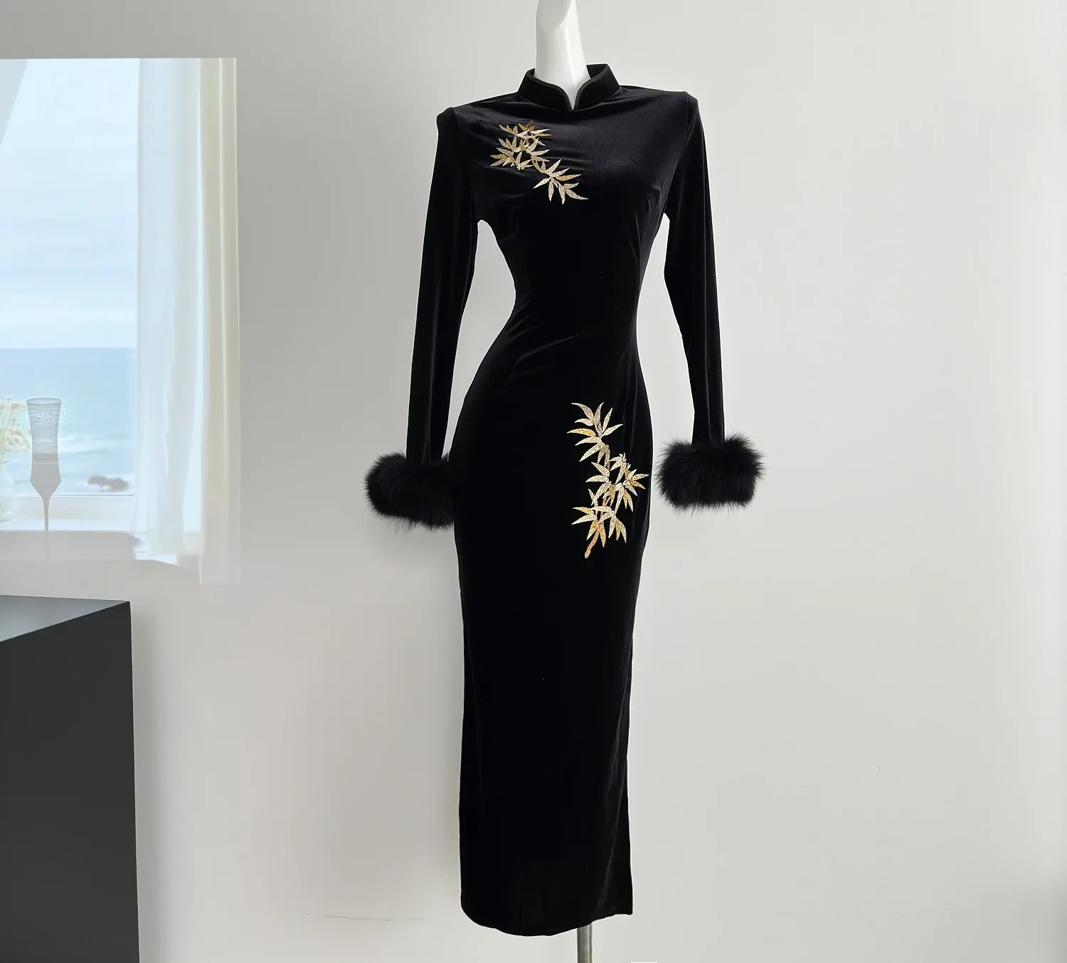 Embroidered Velvet Fur Sleeved Bamboo Dress
