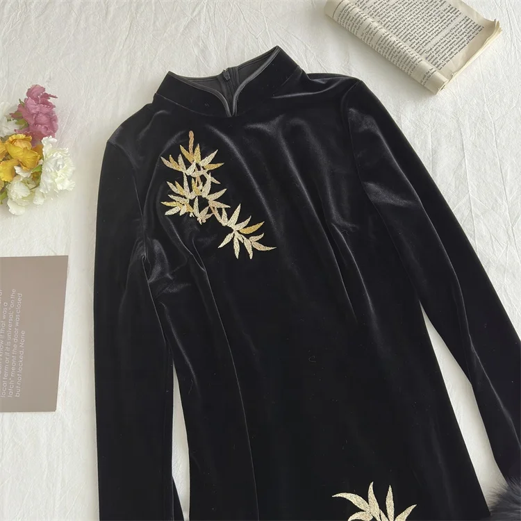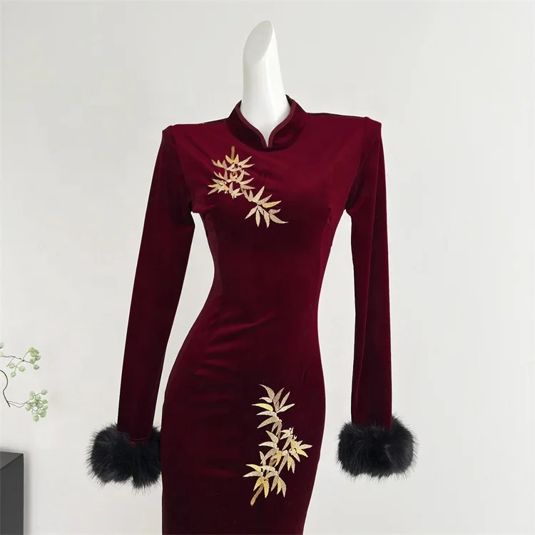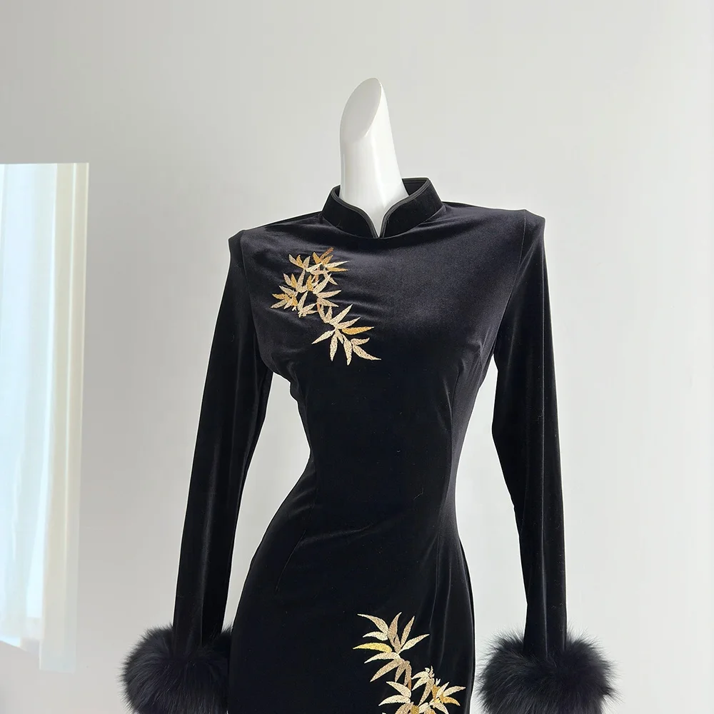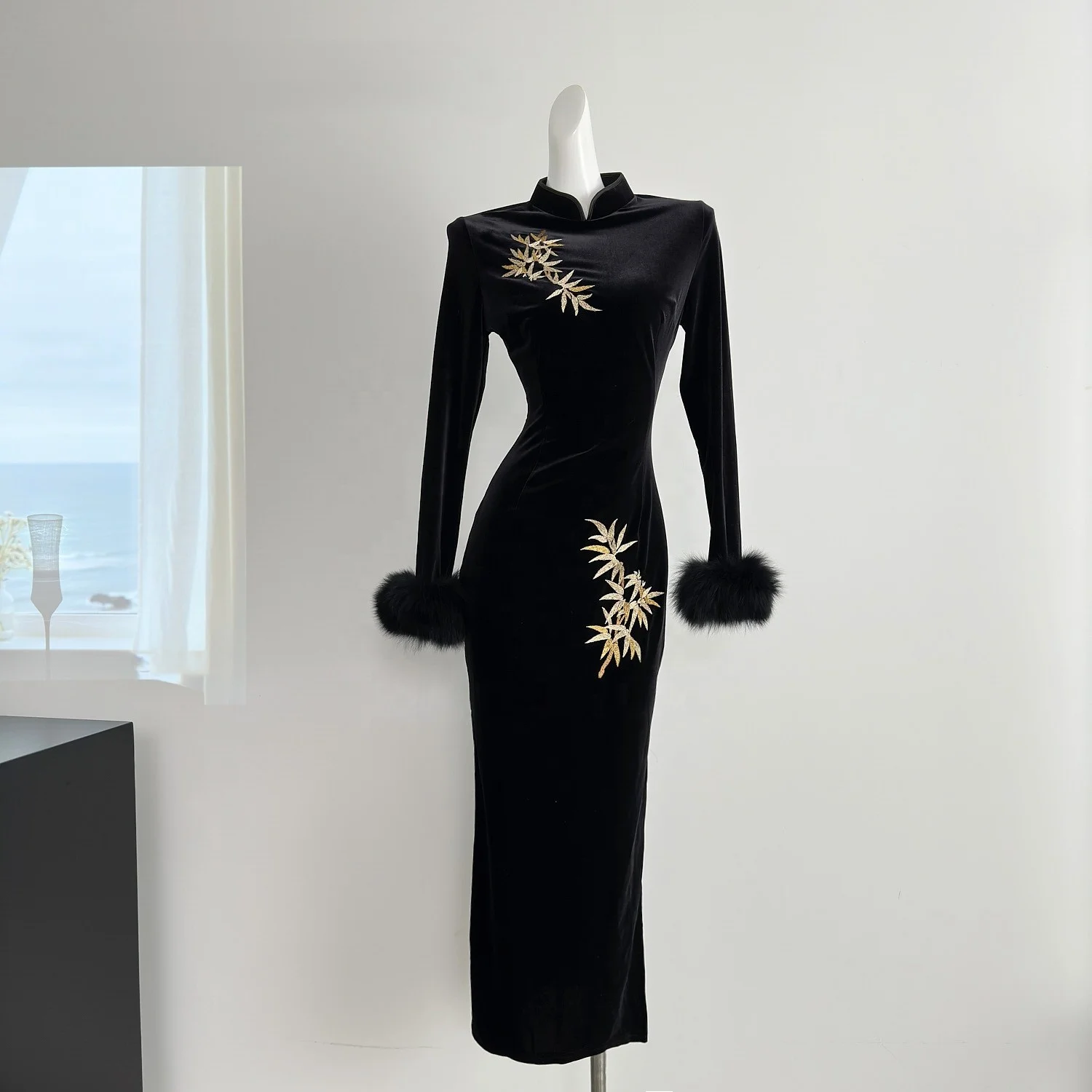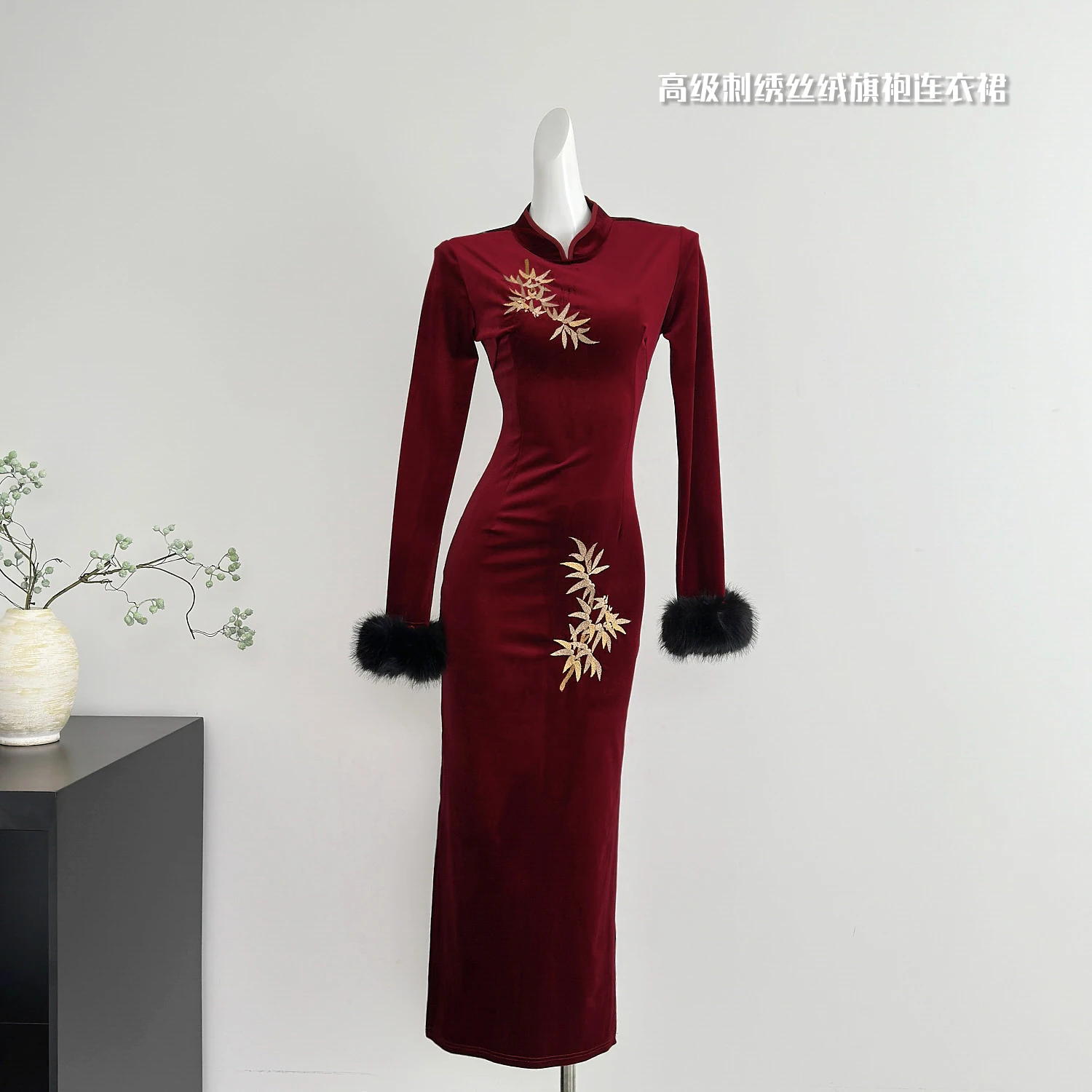 Embroidered Velvet Fur Sleeved Bamboo Dress