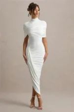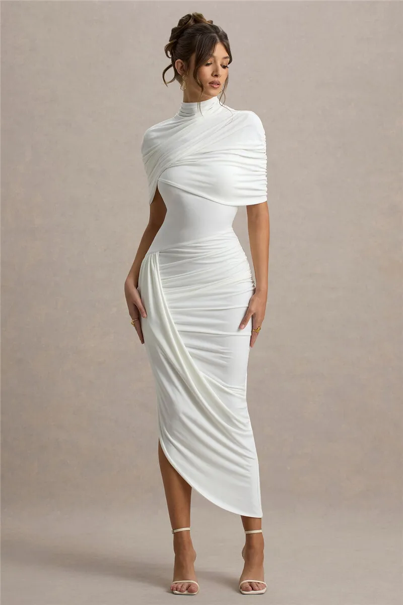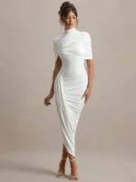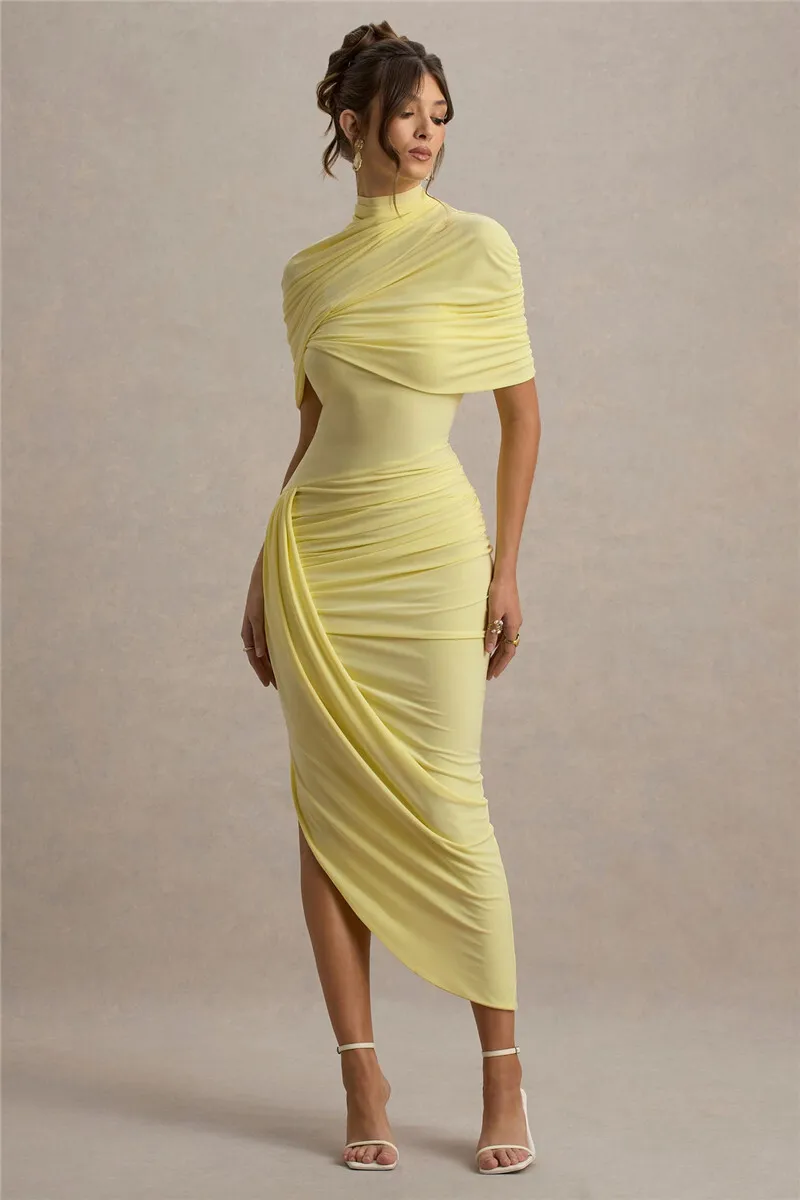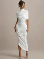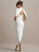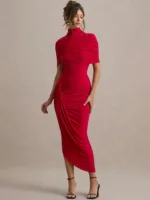 Turn up the allure with this Half Sleeve Backless Ruched Sexy Dress, designed for confident, modern women. Crafted from soft, stretchy polyester and elastane, this ankle-length dress features a flattering A-line silhouette and a slim fit that accentuates your curves. The chic turtleneck and half sleeves offer a sophisticated touch, while the dramatic backless design and ruched detailing add a sexy, club-ready edge. Perfect for spring and summer nights out, this pullover dress is both comfortable and unforgettable, making it a standout choice for any special occasion.