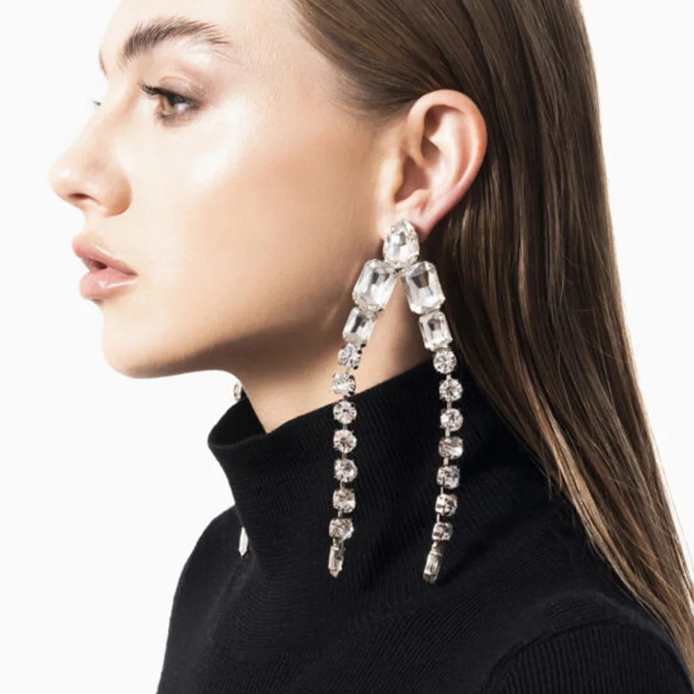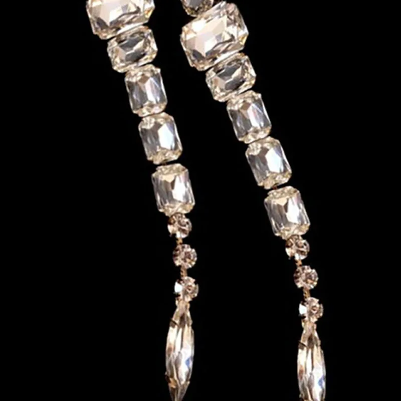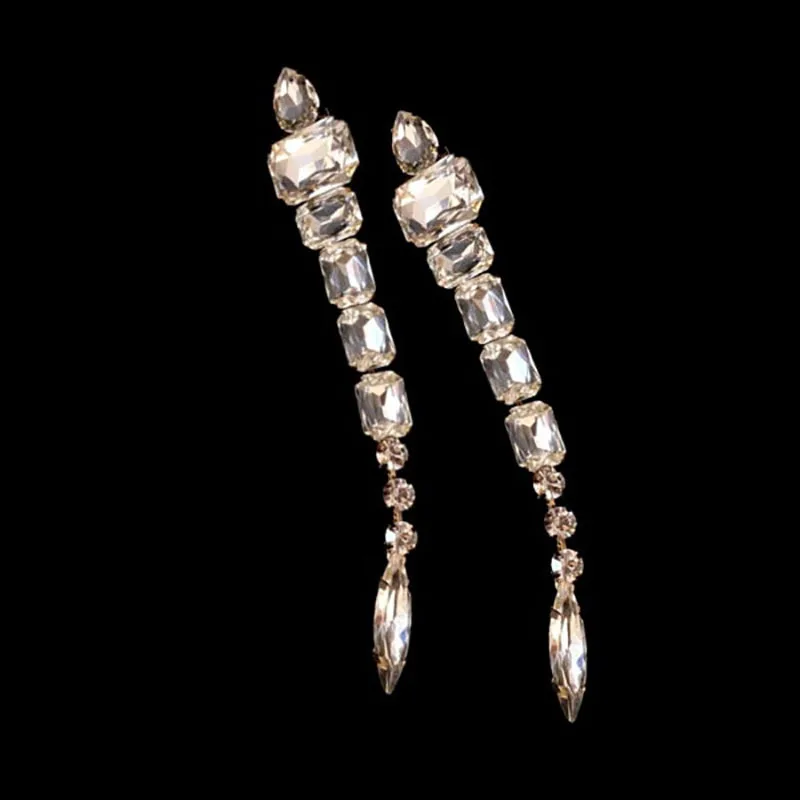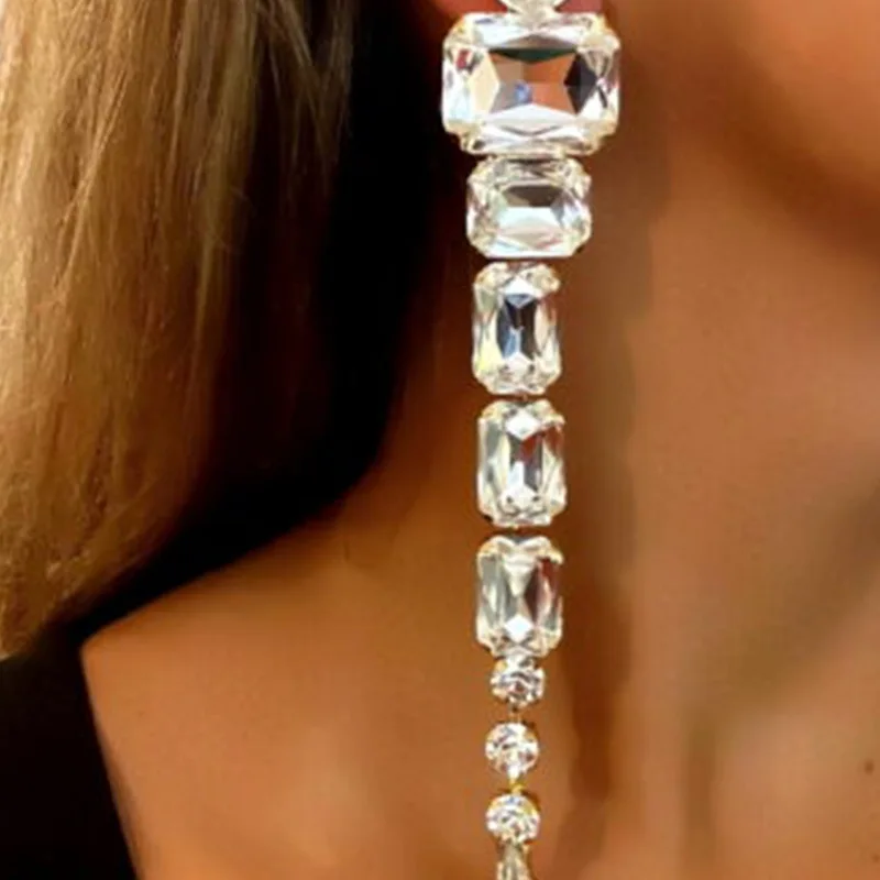 Handmade Crystal Big Square Gemstone Long Drop Dangle Earrings Jewelry for Women Shiny Rhinestone Bridal Tassel Pendant Earrings