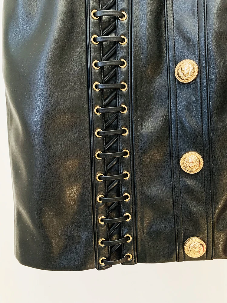 Elevate your style with our Lion Buttons Rope Lace-Up Leather Skirt, showcasing bold lion buttons and a unique lace-up design. Perfect for making a chic statement at any event.