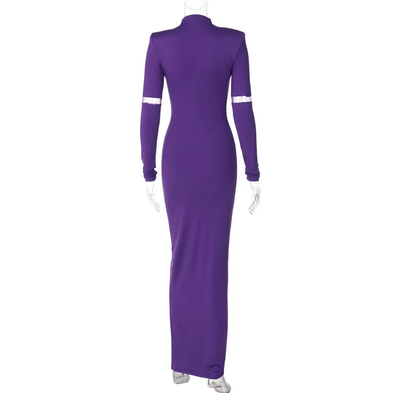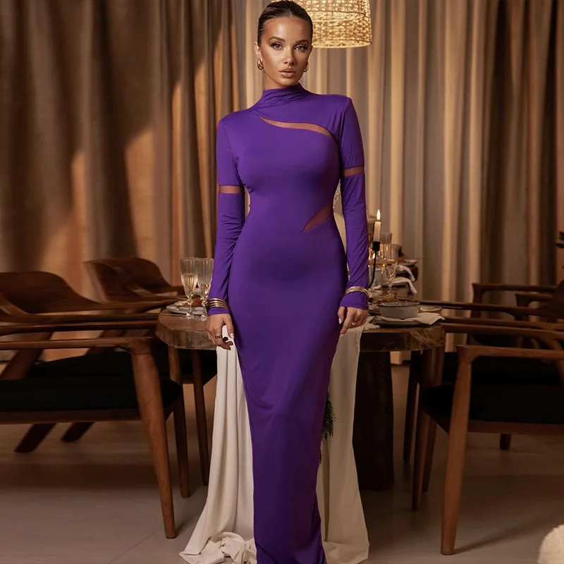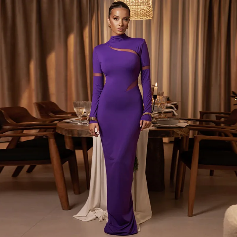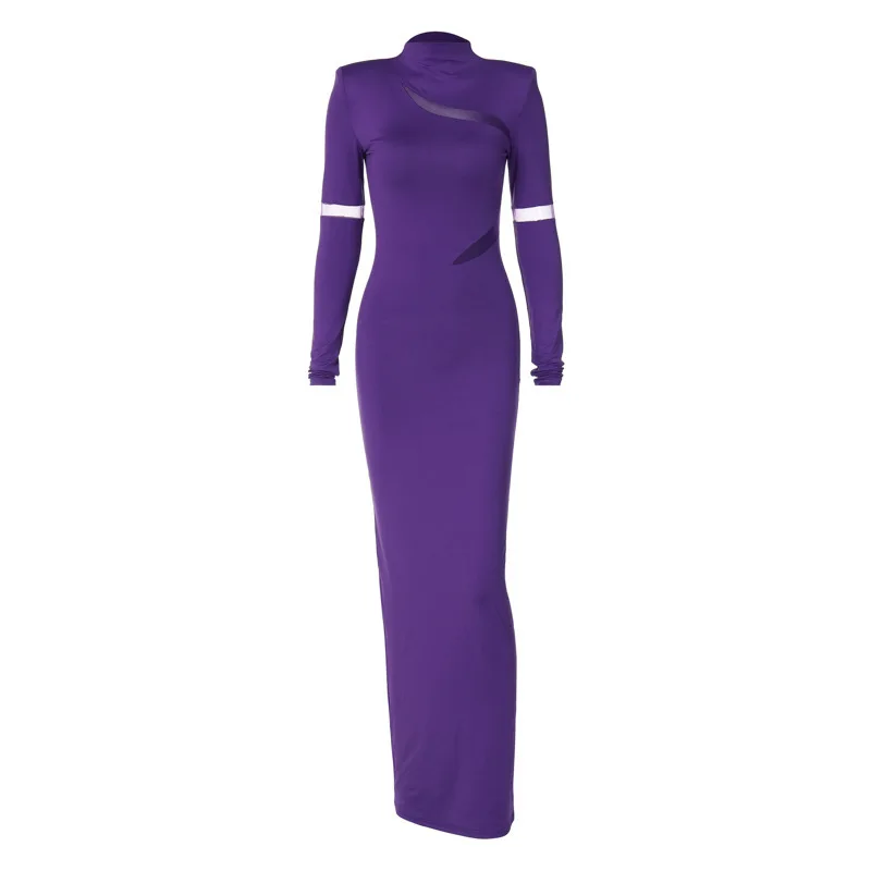 Purple Mesh Hollow Out Patchwork Bodycon Maxi Dress