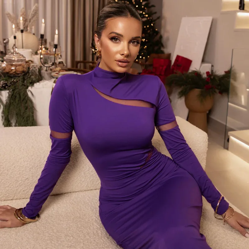 Turn heads with this stunning Purple Mesh Hollow Out Patchwork Bodycon Maxi Dress. Designed to accentuate your curves, this dress combines elegance with a bold touch of modern style. The mesh detailing and hollow-out patchwork create a sultry, eye-catching look perfect for evening events, parties, or special occasions.