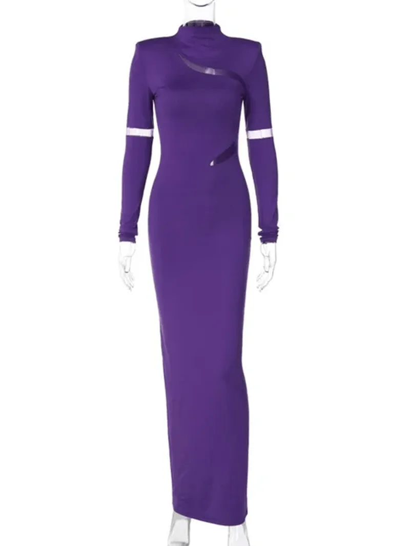 Purple Mesh Hollow Out Patchwork Bodycon Maxi Dress