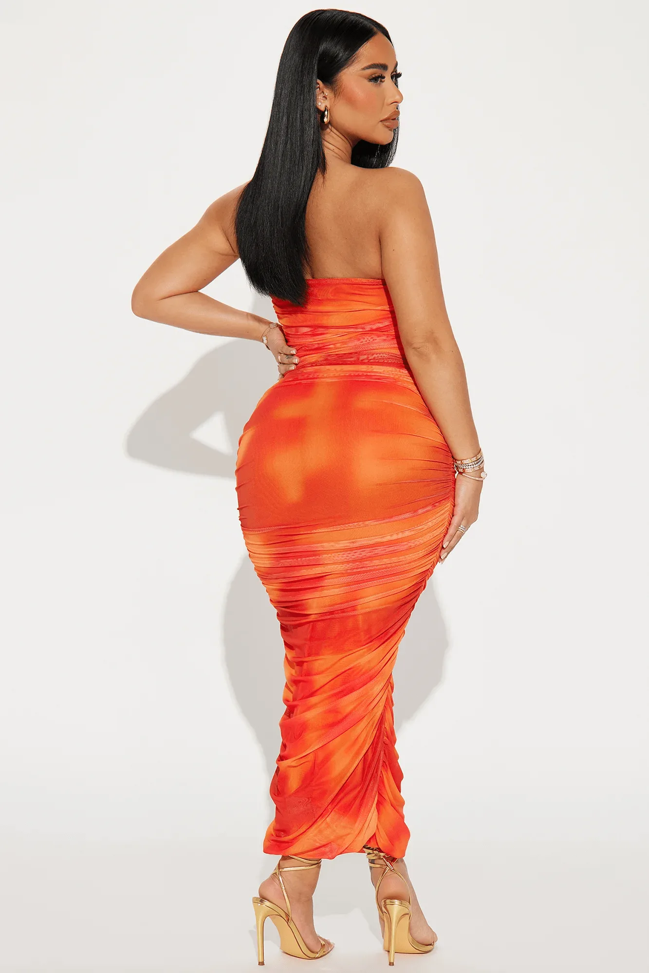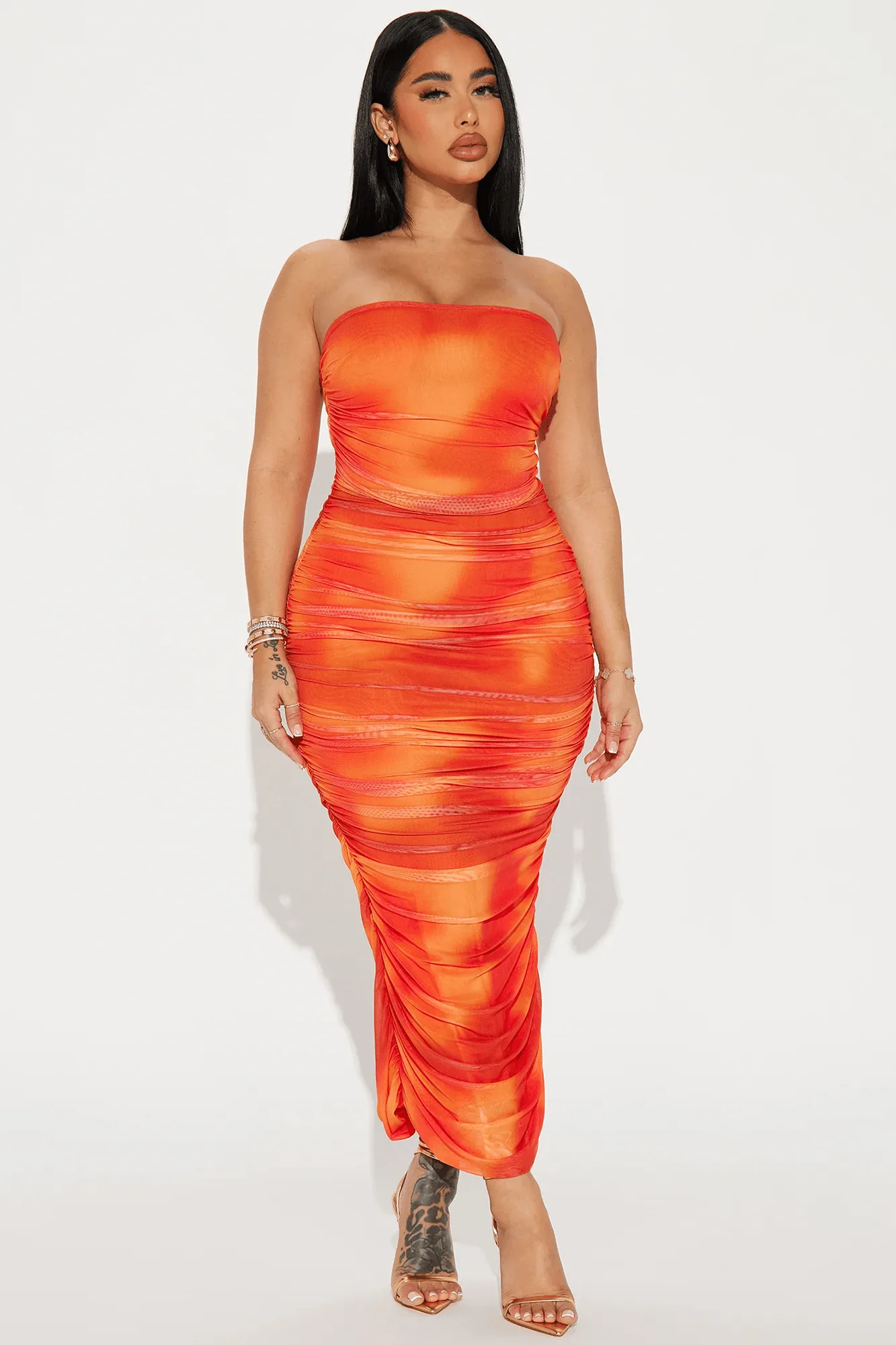 Get ready to turn heads in our vibrant orange midi dress. With its stretchy and lined fabric, this dress provides both comfort and style.