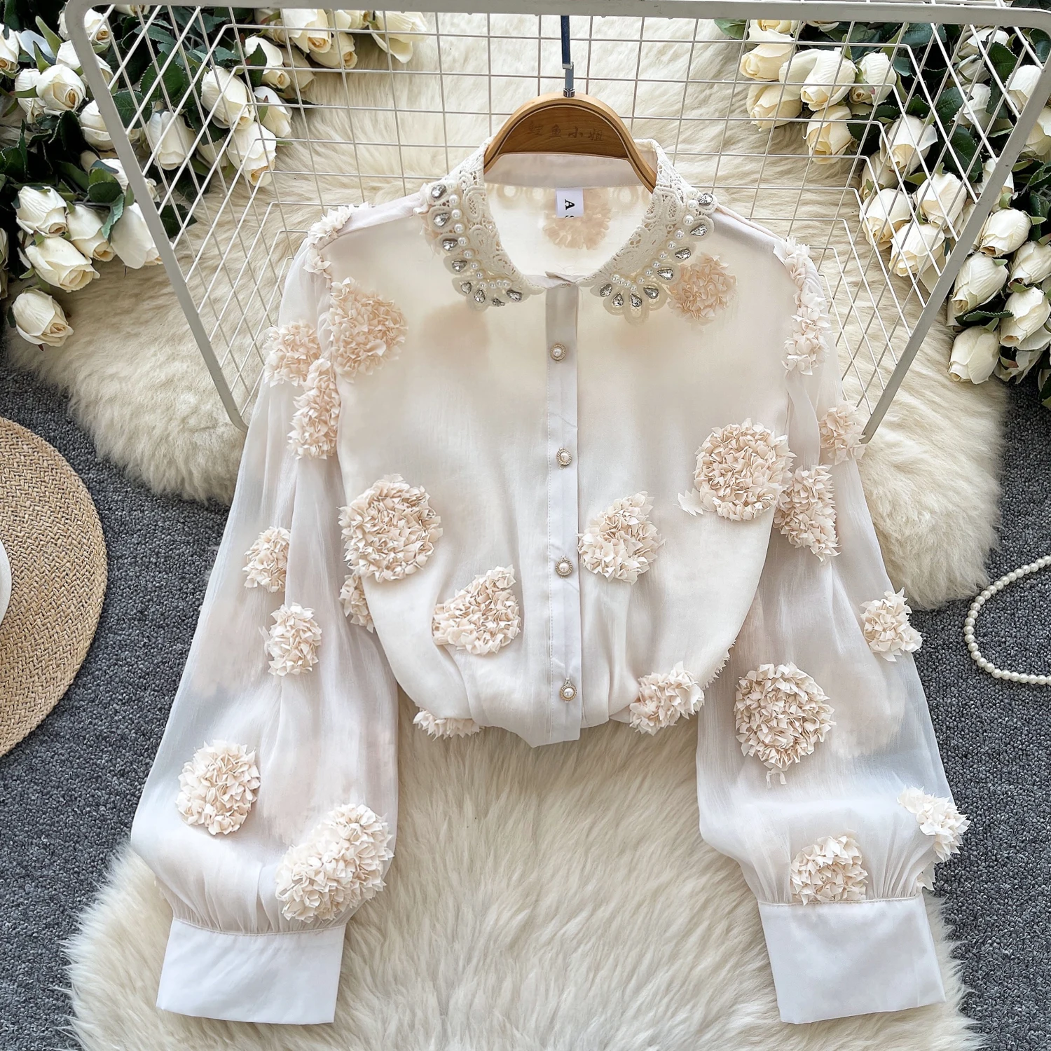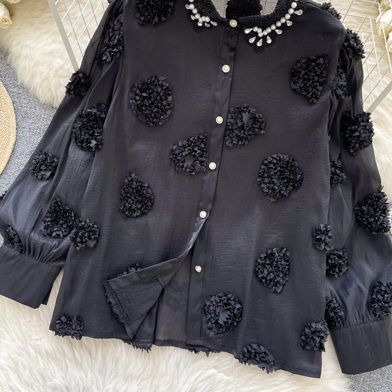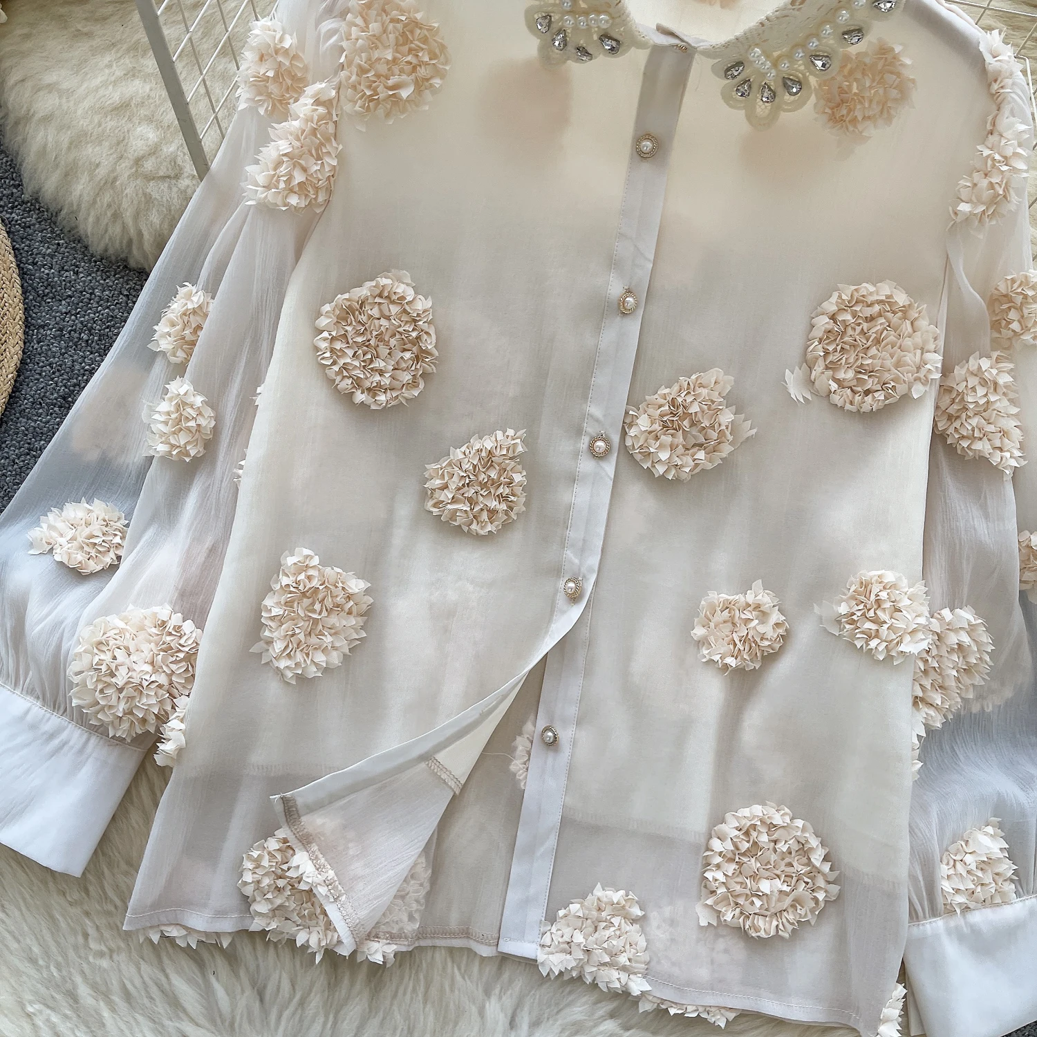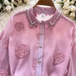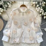 Beaded Sequined Flowers Stitch Mesh Shirts