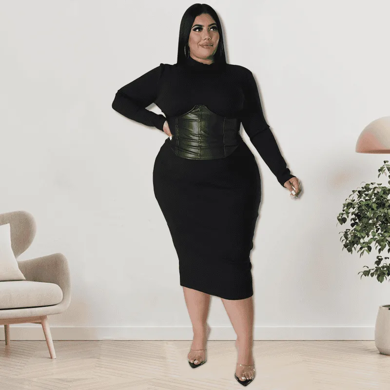 Elevate your fashion game with our Plus Size PU Leather Patchwork Dress, designed to make a bold statement. This dress combines luxurious PU leather with intricate patchwork, offering a unique and edgy look. Perfect for special occasions, it provides a flattering fit that accentuates your curves while ensuring comfort and style.